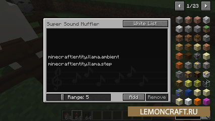 Бродя по миру майнкрафт вы слышите различные фоновые звуки, которые иногда просто до бешенства могут довести. Теперь данную проблему можно решить используя мод Super Sound Muffler. Вы можете полностью настроить звуки, которые будут воспроизводиться во время игры. Какие то звуки можно убрать вообще, какие то сделать тише.